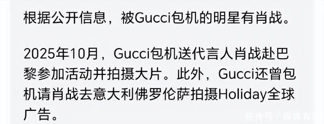 此前还有别家粉丝说肖战的奢牌代言掉了,然后就发现奢牌给肖战包机了。这待遇真是煞羡旁人呐! 很多人可能不知道,肖战已经在很多次晚会上穿着Gucci订制的西装礼服,肖战担任Gucci品牌代言人期间,Gucci更换了多位CEO或创意总总监,但是肖战的待遇都一直很好。此前看秀期间还被网友调侃“CEO会变肖战的座位不会变”。也有部分网友玩梗表示:“高奢不高冷,只是暖的不是你”。